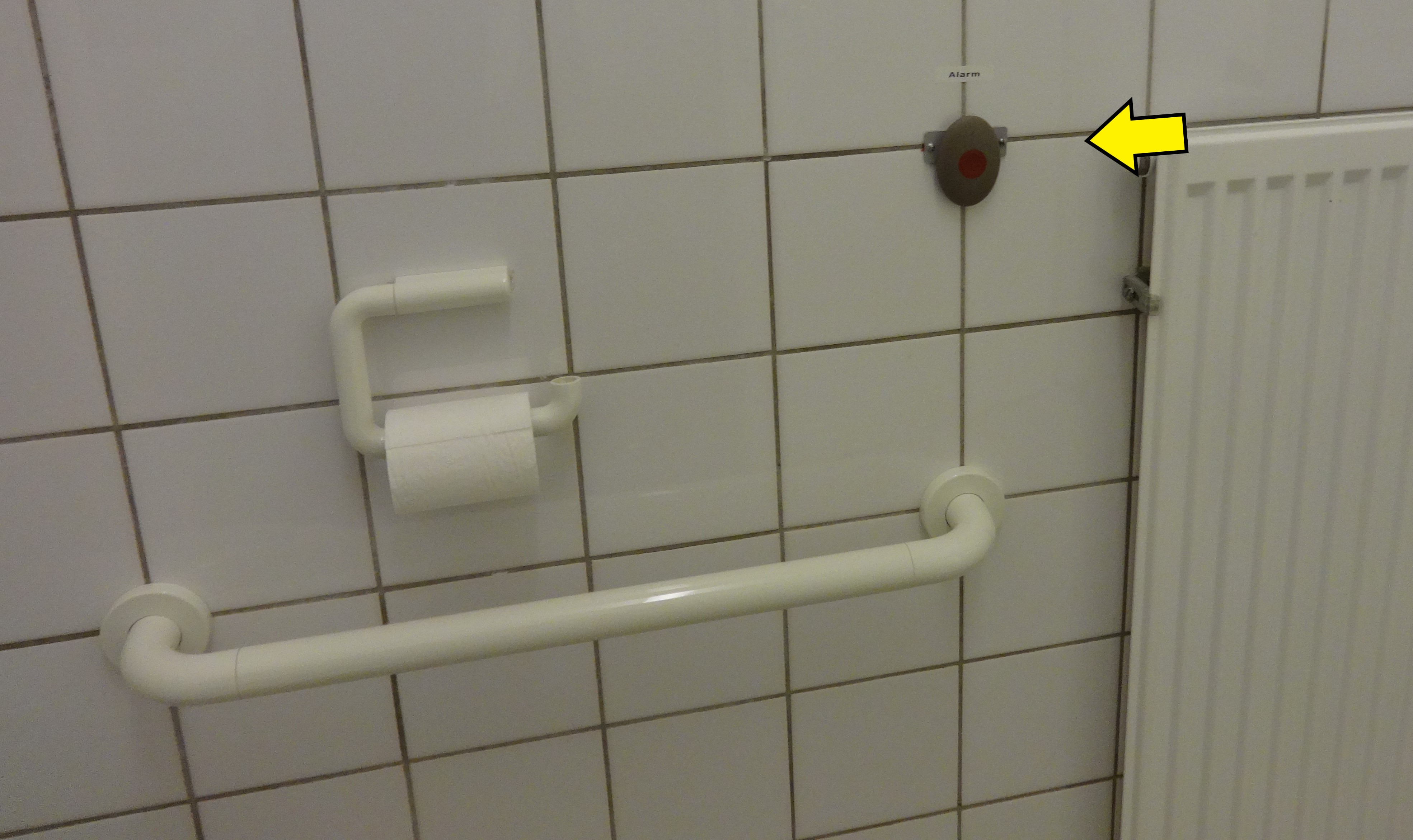 Im Erdgeschoss befindet sich ein Behinderten-WC. Sie finden es auf dem Gang zur Kantine. Im WC befindet sich links ein Notrufknopf (s. Foto). Nach Betätigen des Notrufknopfes erscheint in kürzester Zeit eine Hilfsperson.